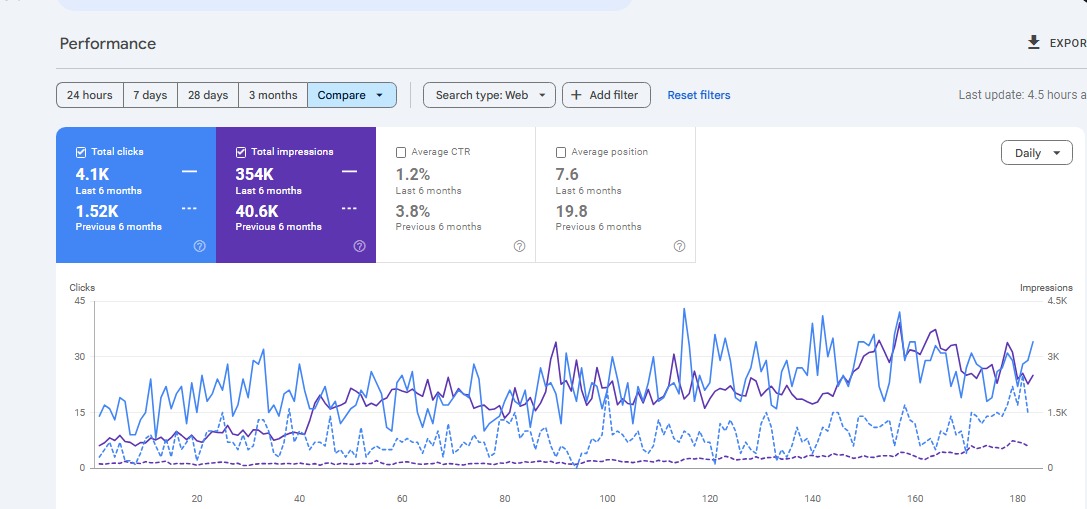 Over the last 6 months, organic clicks increased from 1.5K to 4.1K, showing steady traffic growth. Search impressions surged from 40.6K to 354K, reflecting major visibility improvements. The average position improved significantly from 19.8 to 7.6, moving key terms closer to page one. Overall, the site now delivers consistent organic growth through structured SEO efforts.