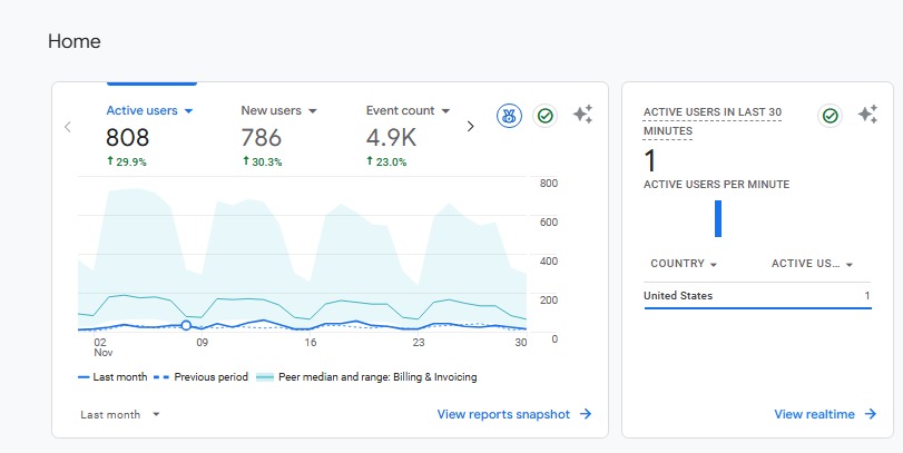 Over the last month, the website recorded 808 active users, reflecting a 29.9% growth in engagement. New users reached 786, showing a 30.3% increase compared to the previous period. Total event count rose to 4.9K, up by 23%, indicating stronger user interactions. Overall, traffic quality and user activity continue to trend upward with consistent performance gains.